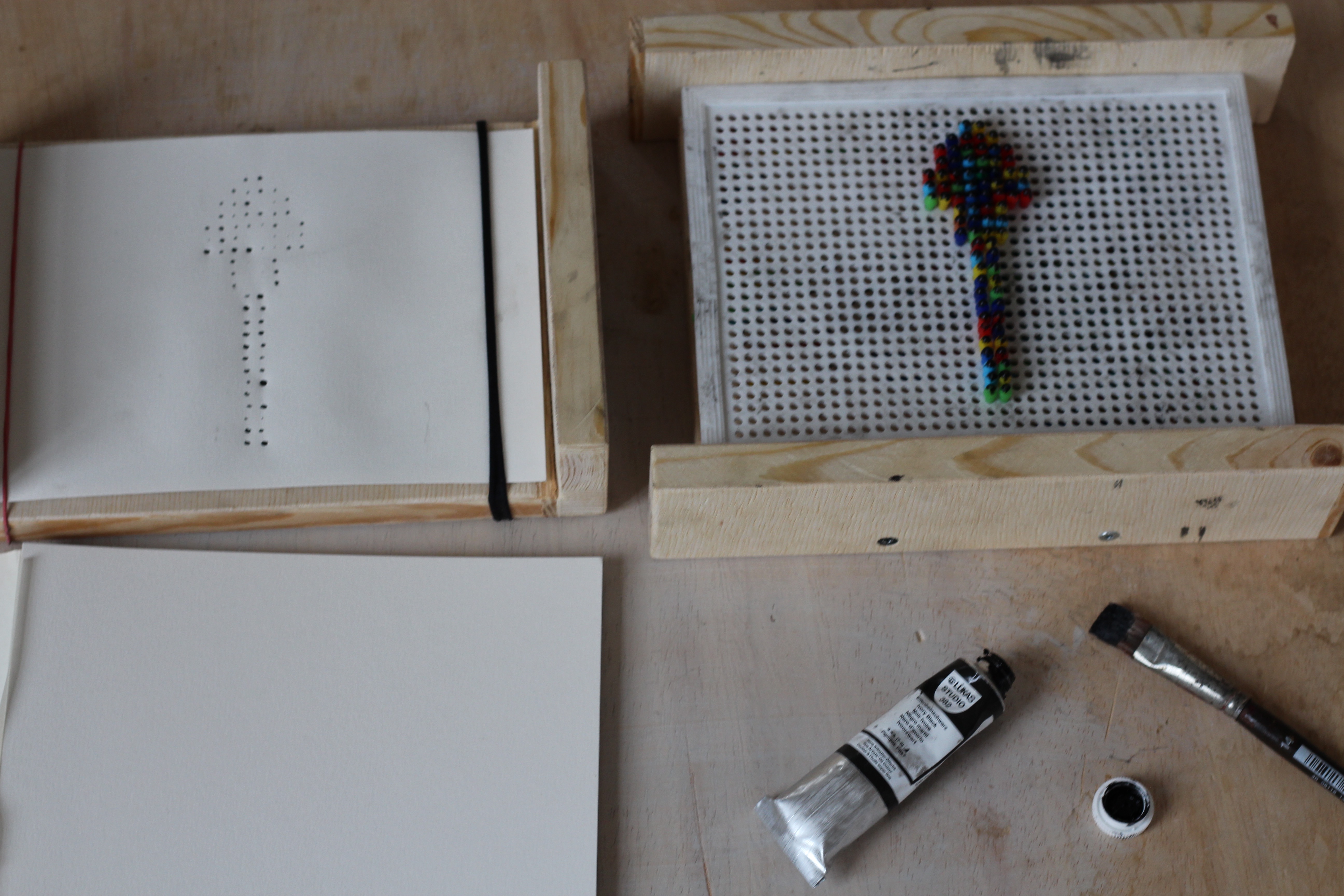 Papier (DIN A5), (Öl)farbe, Pinsel, Schwamm, Öl |