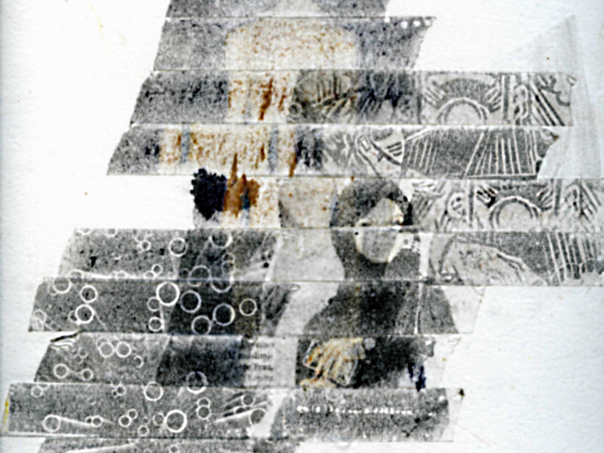 Dafür nimmt man ein Stück Klebeband, klebt es auf den Zeitungsabschnitt an dem sich das ausgewählte Wort, Schriftzeichen etc. befindet und zieht das Klebeband vorsichtig wieder ab. Es bleibt nur das Pigment am Klebeband haften. Das Klebeband kann nun auf einen anderen Bildträger (z.B. Papier oder Karton A4) aufgeklebt und arrangiert werden. |