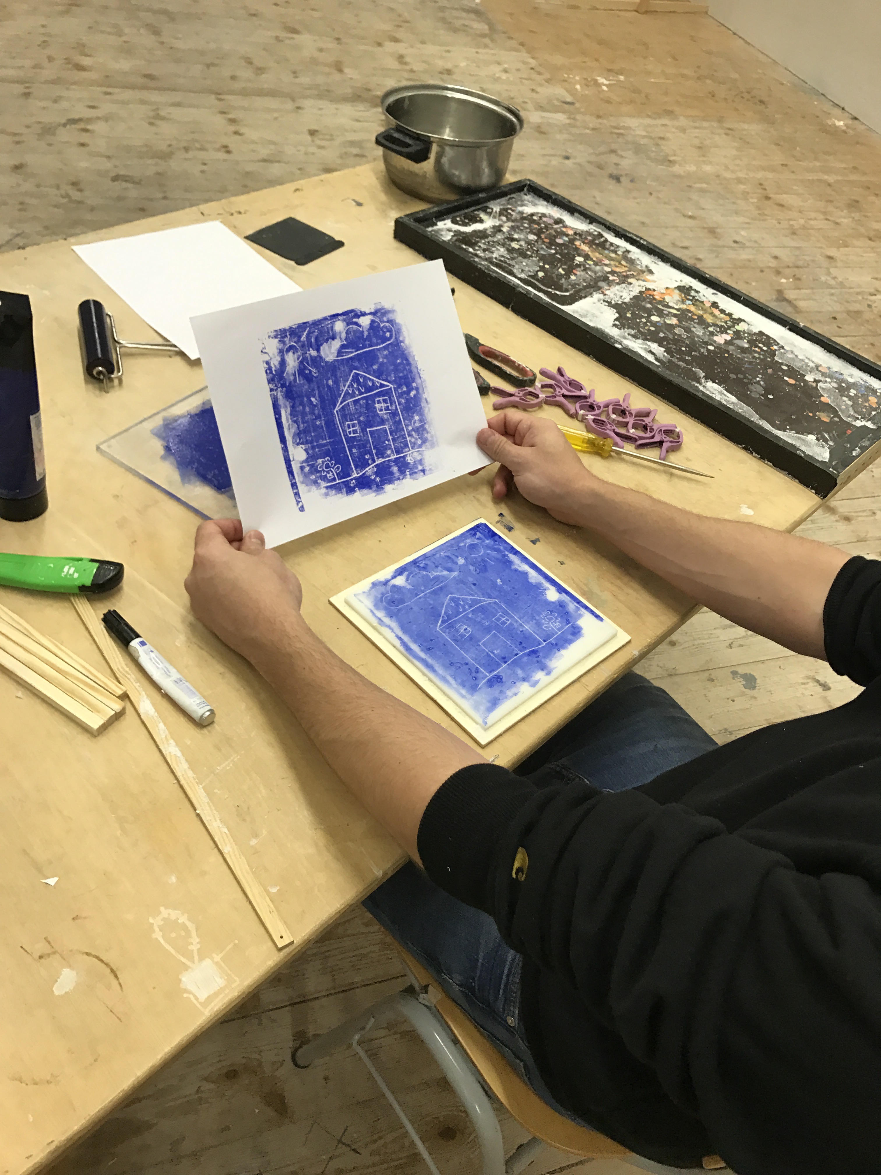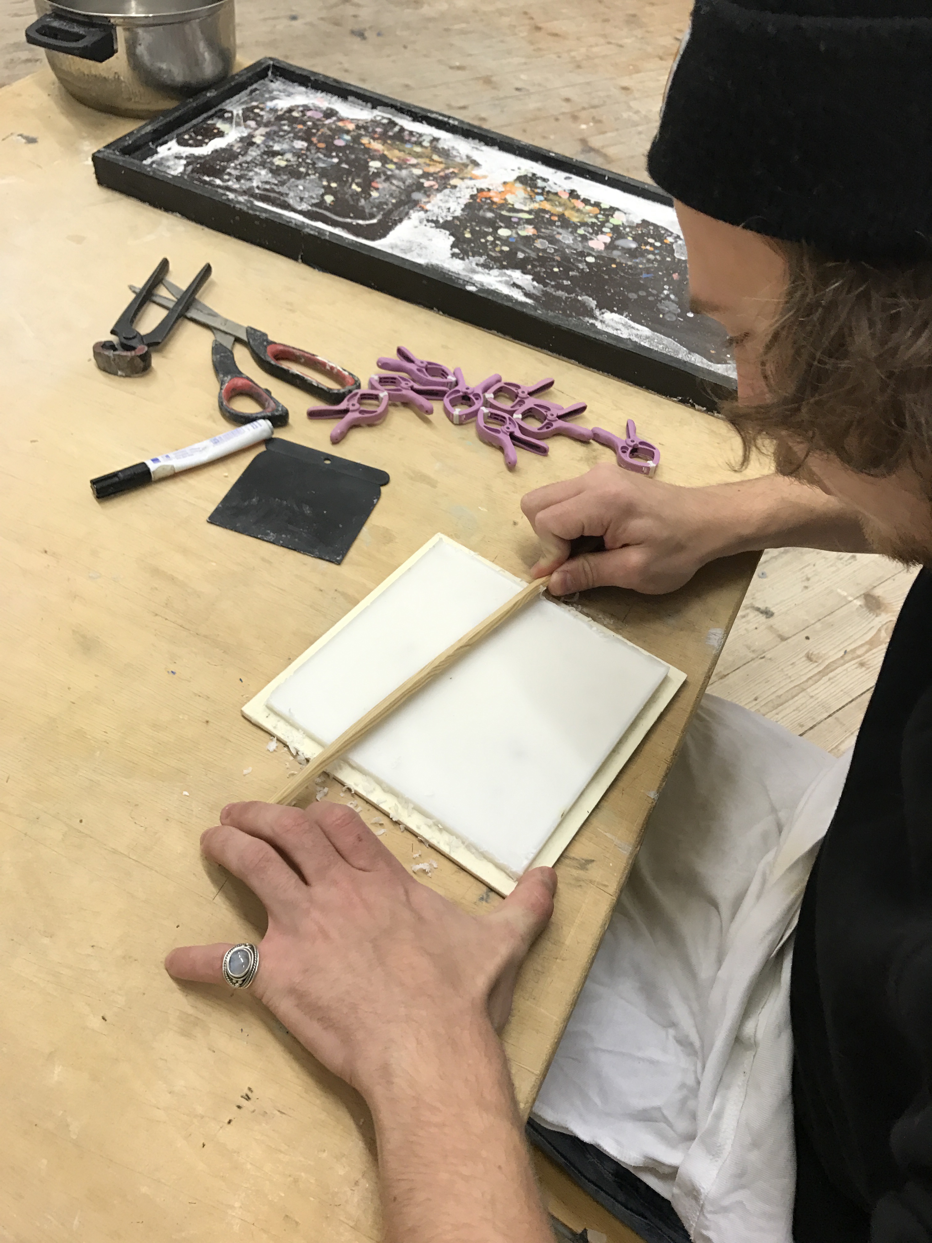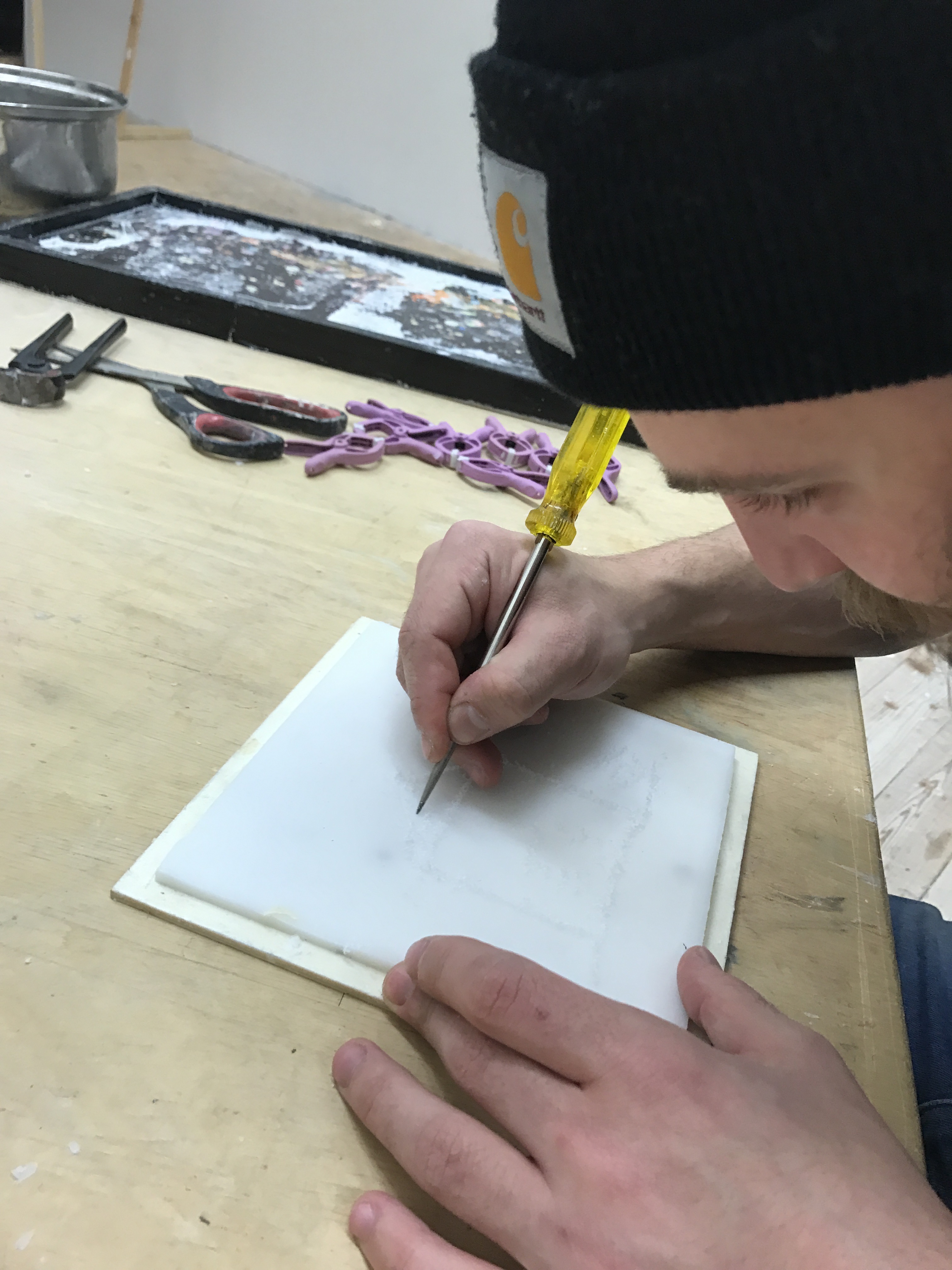 - Nun bereiten wir den Druckstock vor, dazu hobeln wir mit einem langen Randstück oder mit einem Lineal die Oberfläche eben