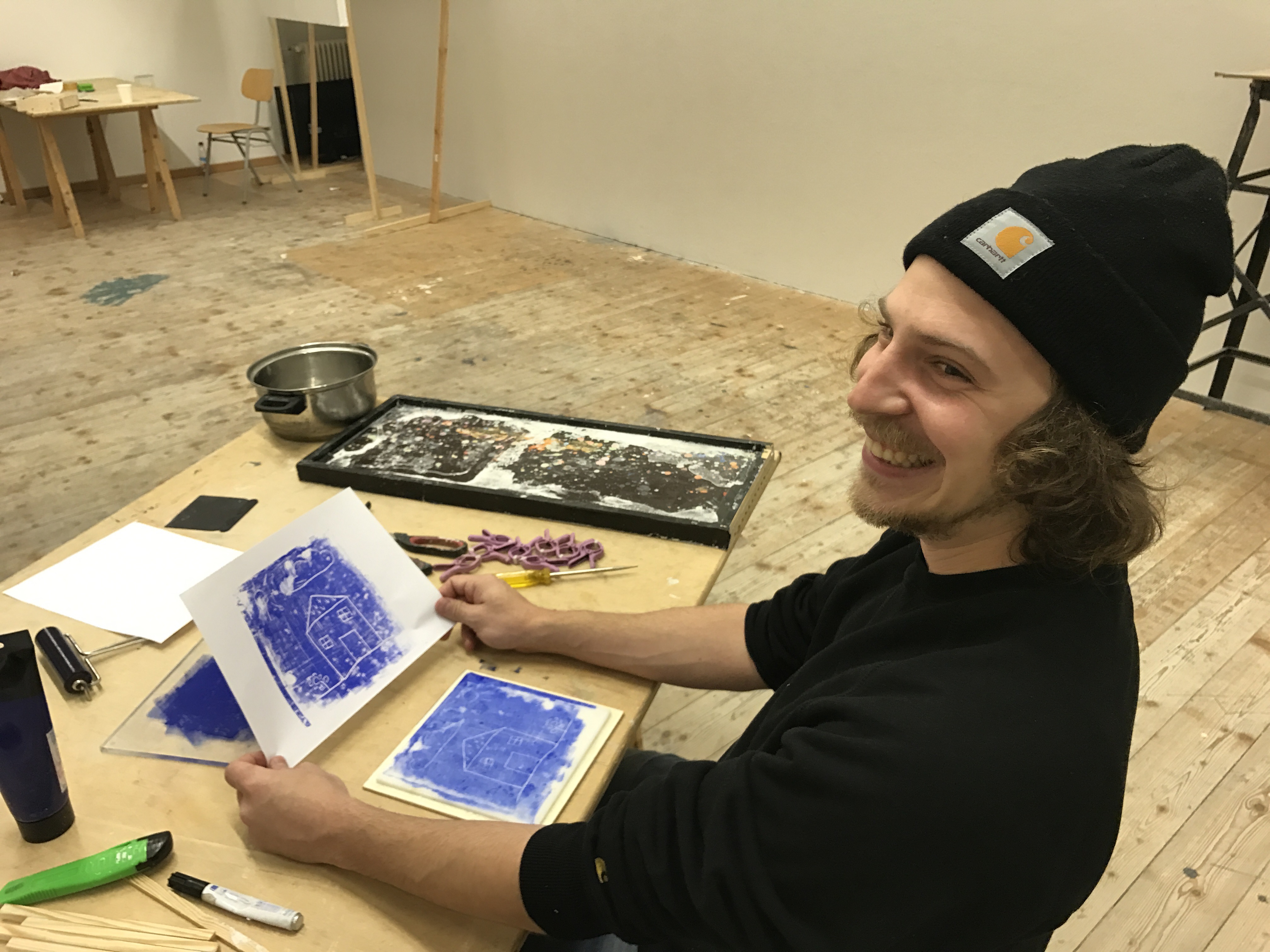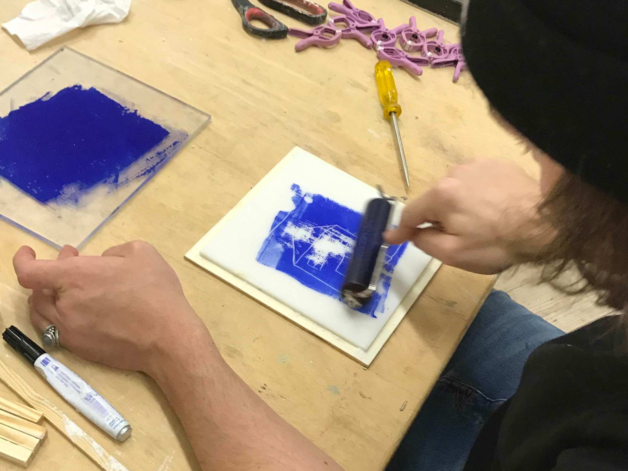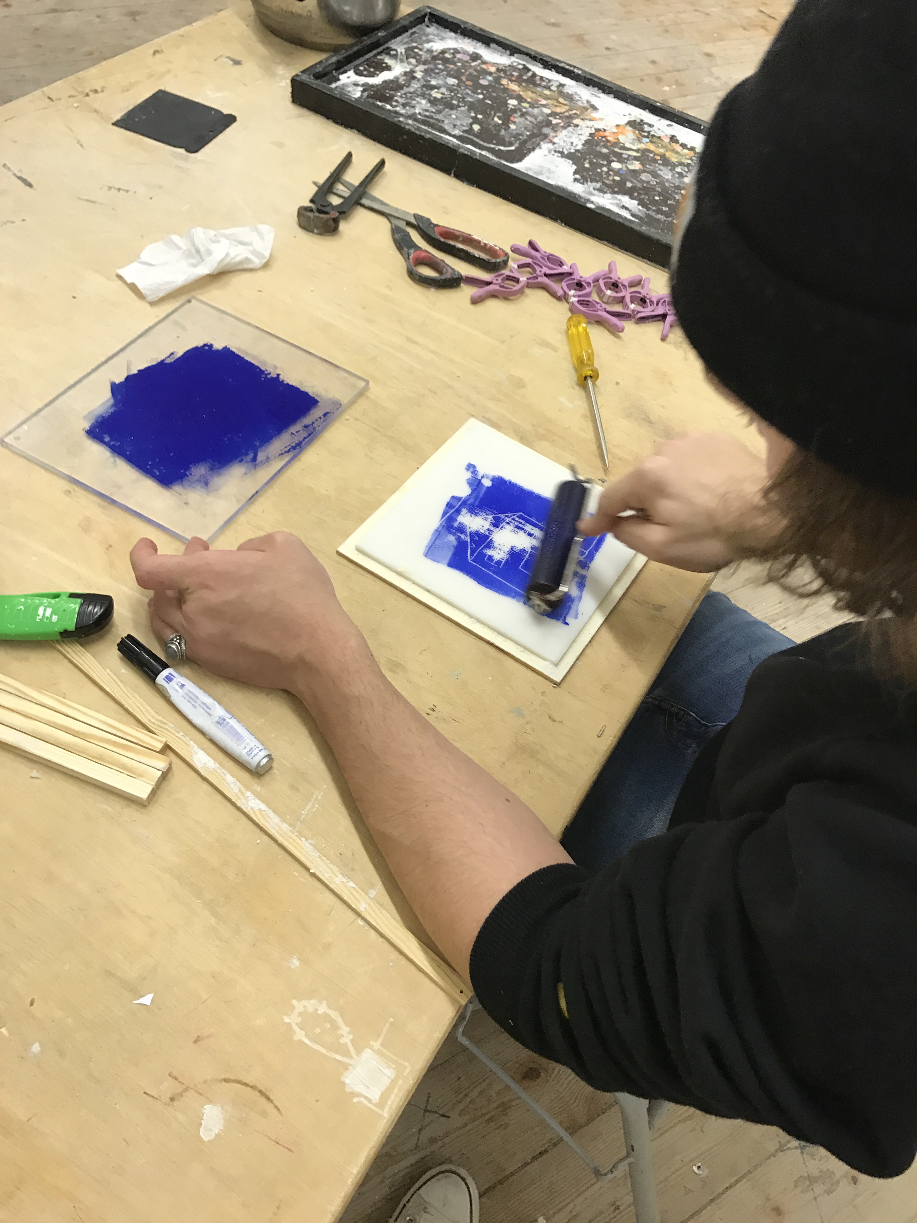 - Nun bereiten wir den Druckstock vor, dazu hobeln wir mit einem langen Randstück oder mit einem Lineal die Oberfläche eben